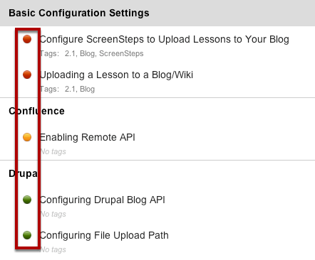 The status of a lesson is represented by a colored dot that appears next to the lesson title. There are four status settings:
