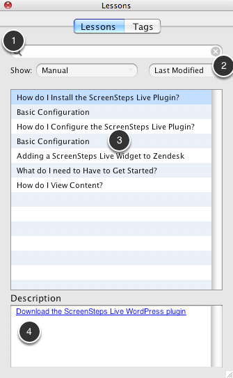 The Lesson Palette displays all of the lessons in the current library. You can search (1) and sort (2) lessons. The lessons will be displayed in a list (3). The description for the selected lesson will be displayed below (4).