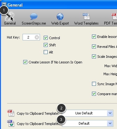 On the General tab you can select the template you would like to use when copying a lesson to the clipboard as PDF (2) or HTML (3).