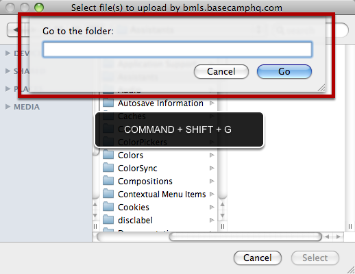 With the file dialog window open, hold down the COMMAND + SHIFT + G keys to open the Go to the folder window.